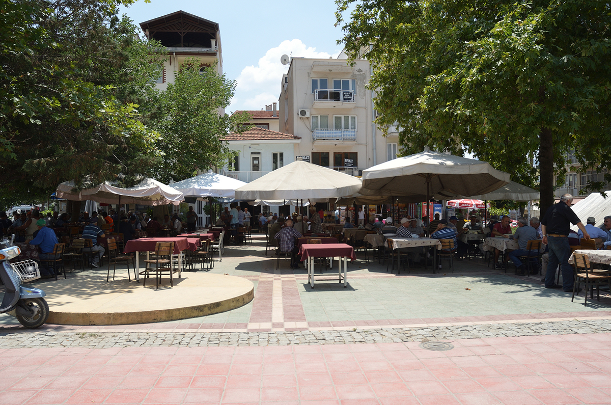 기차역 근처 노천 식당에서 더위를 피해 사람들이 차를 마시고 있다.