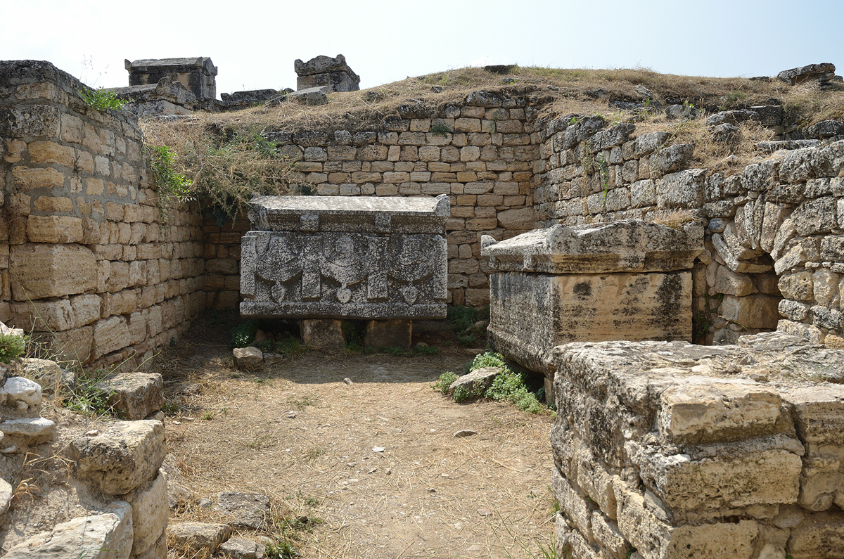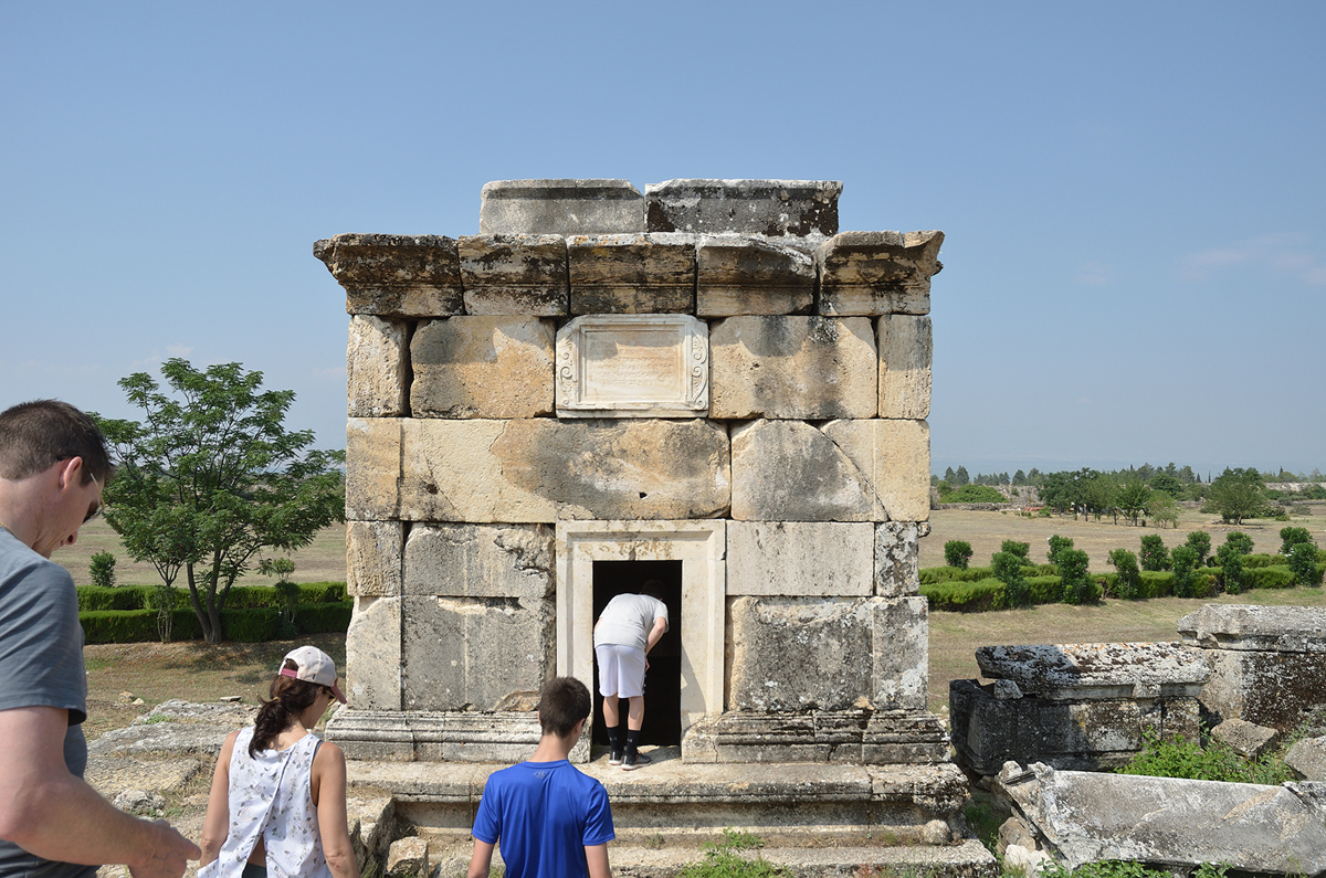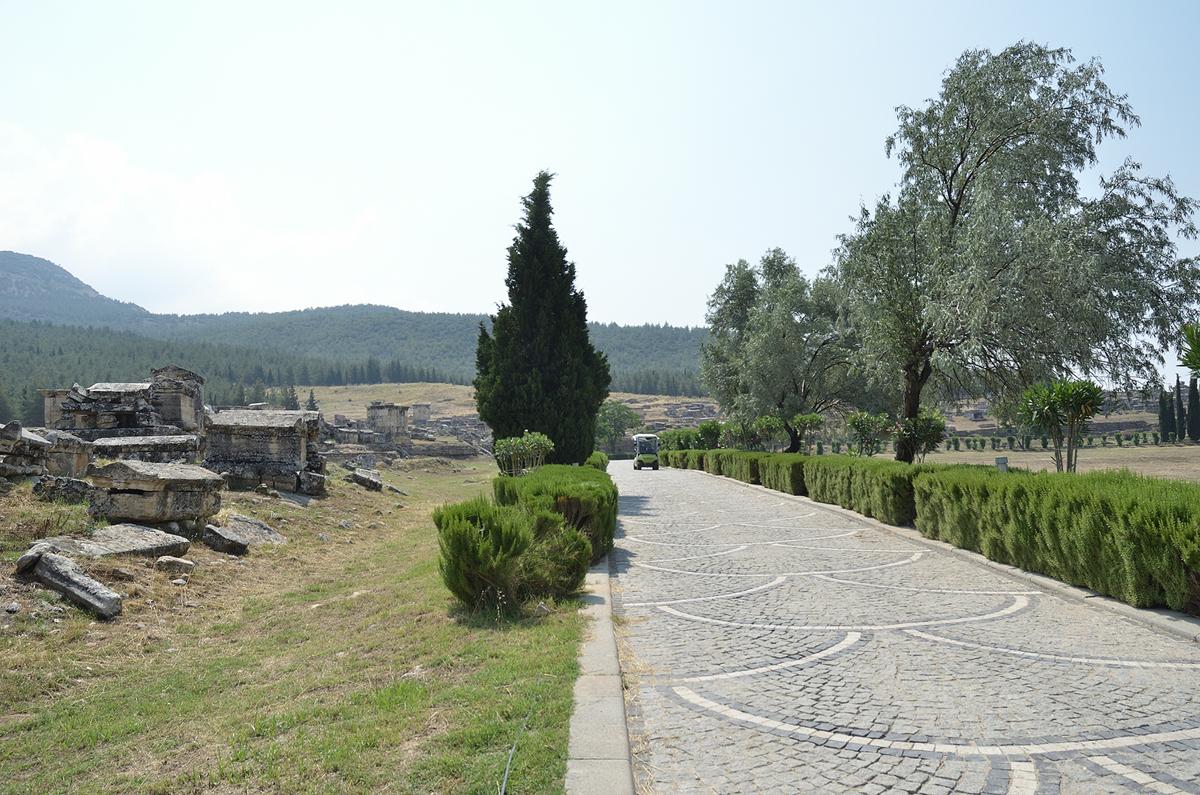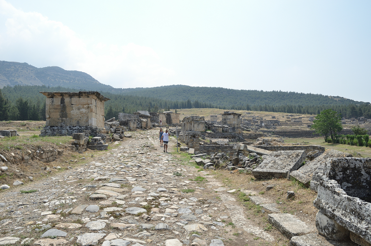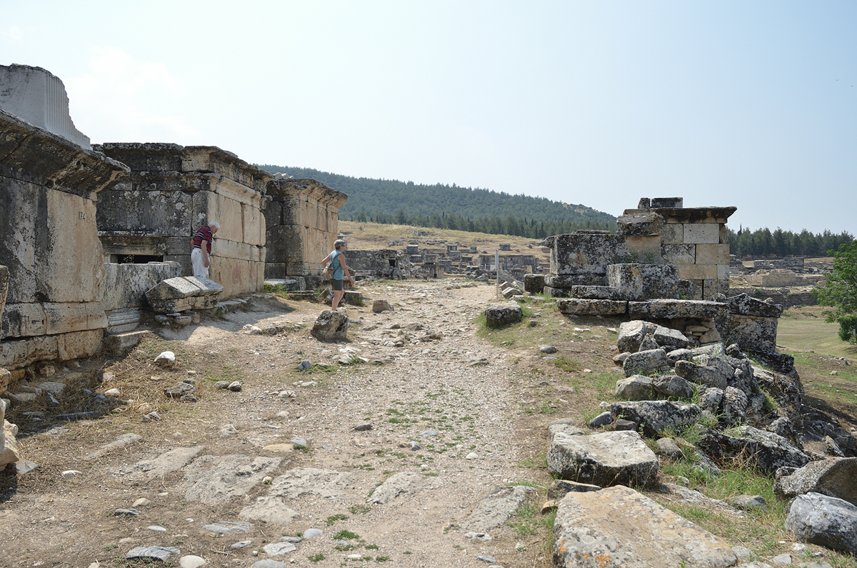 길 양옆으로 보이는 유적들... 실제로는 모두 돌무덤 또는 관들이다. 예전 파묵칼레에 흐르는 물이 피부병에 효과가 있다해서 많은 환자들이 치료를 하기 위해 왔었다고 한다. 하지만 애석하게도 왔다가 완치를 못하고 파묵칼레에서 생을 마감한 사람들의 무덤이다. 길을 따라 걸으며 무덤들을 감상(?)해 본다.