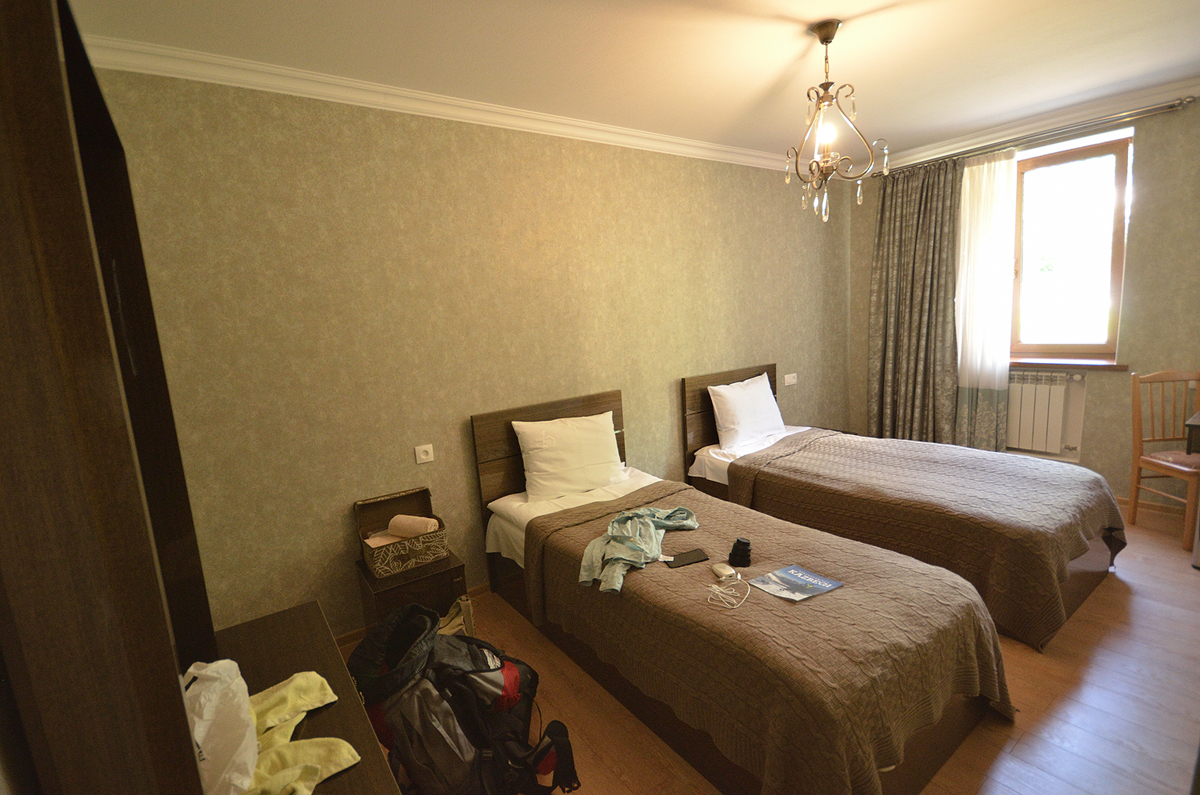 카즈베기 숙소로는 사메바 교회와 카즈베기 산을 전망할 수 있는 룸스 호텔이 유명하긴 하나 너무 비싸다. 그 외 저렴하면서 전망도 좋은 게스트 하우스들이 많으므로 게스트 하우스 이용을 적극 추천한다. 비용은 미리 예약한다면 2~3만원 선에서 해결 가능하다. 그리고 카즈베기 마을 중심으로 테레크 강이 흐르는데 동쪽 즉 룸스 호텔이 있는 쪽에 숙소가 많으며 이쪽이 전망도 좋으므로 이쪽 방면으로 숙소를 잡길 권한다.
