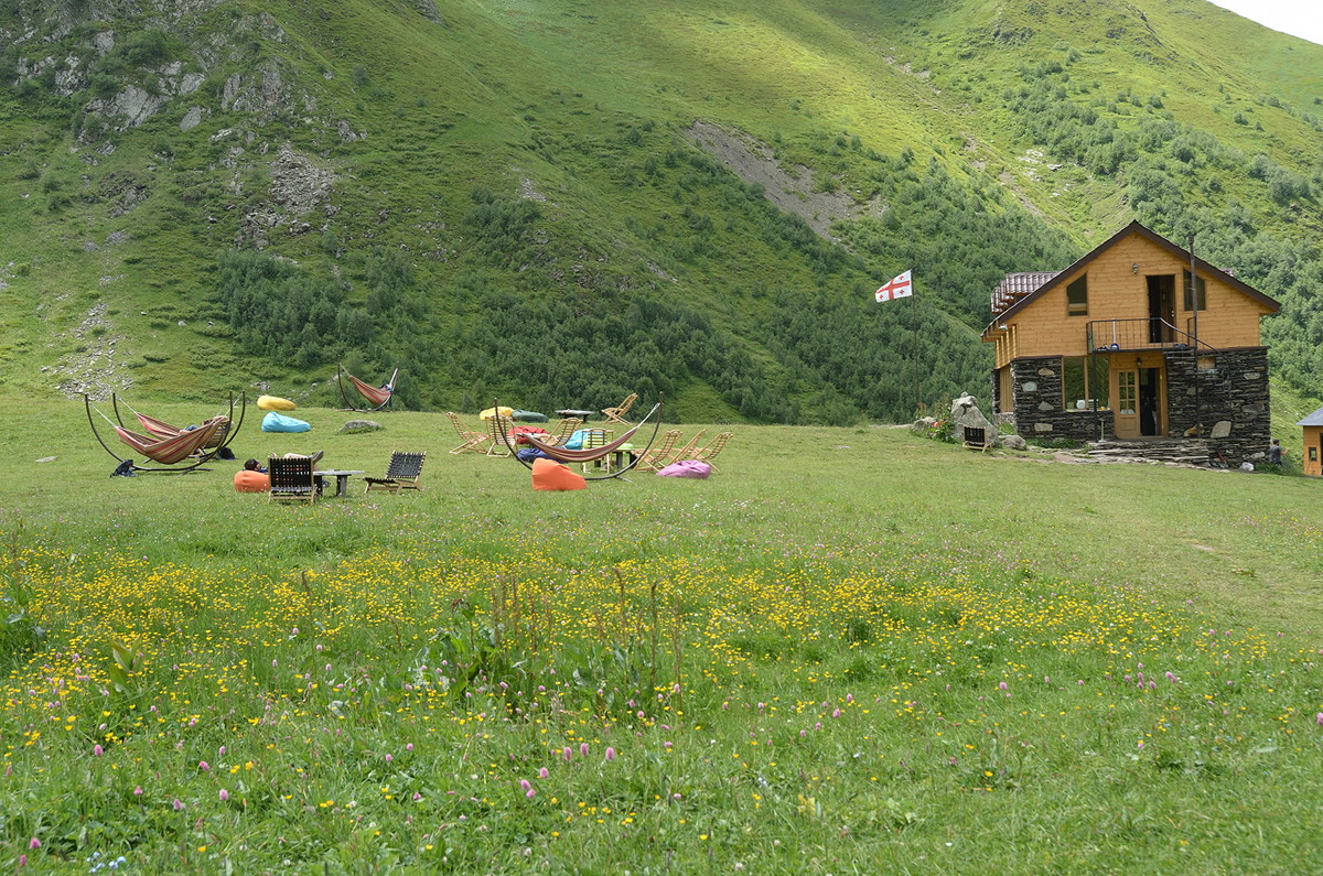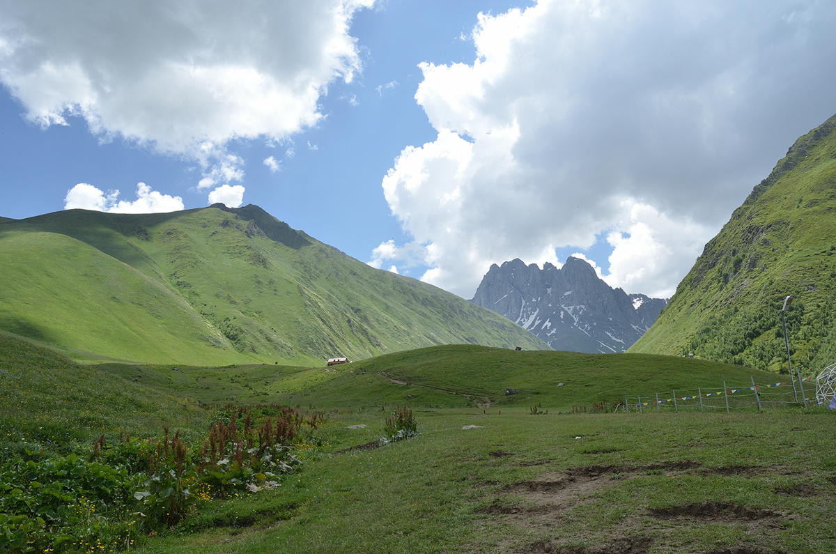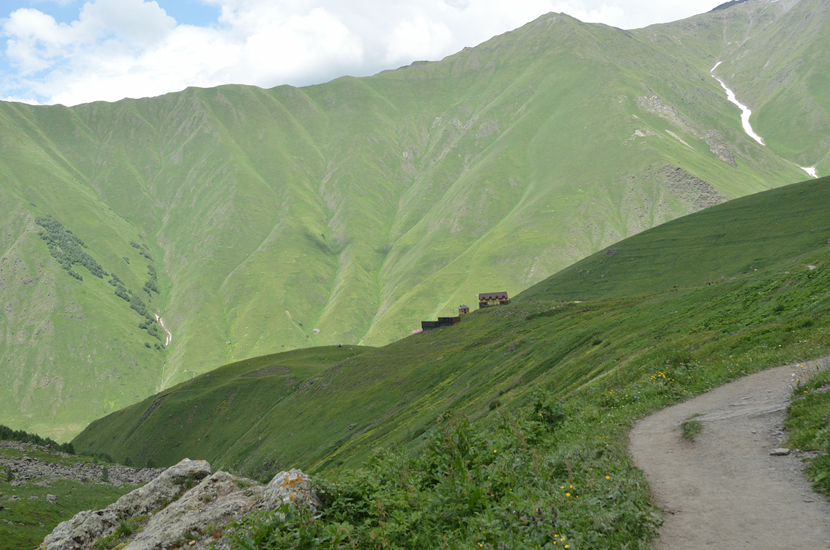 Chaukhi Pass 가기 전에 위치한 Cafe. 이 곳부터 오르막 경사가 조금 심해지며 저 위 돌산 왼편쪽의 언덕(?)을 넘게 된다.