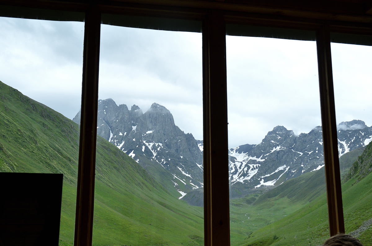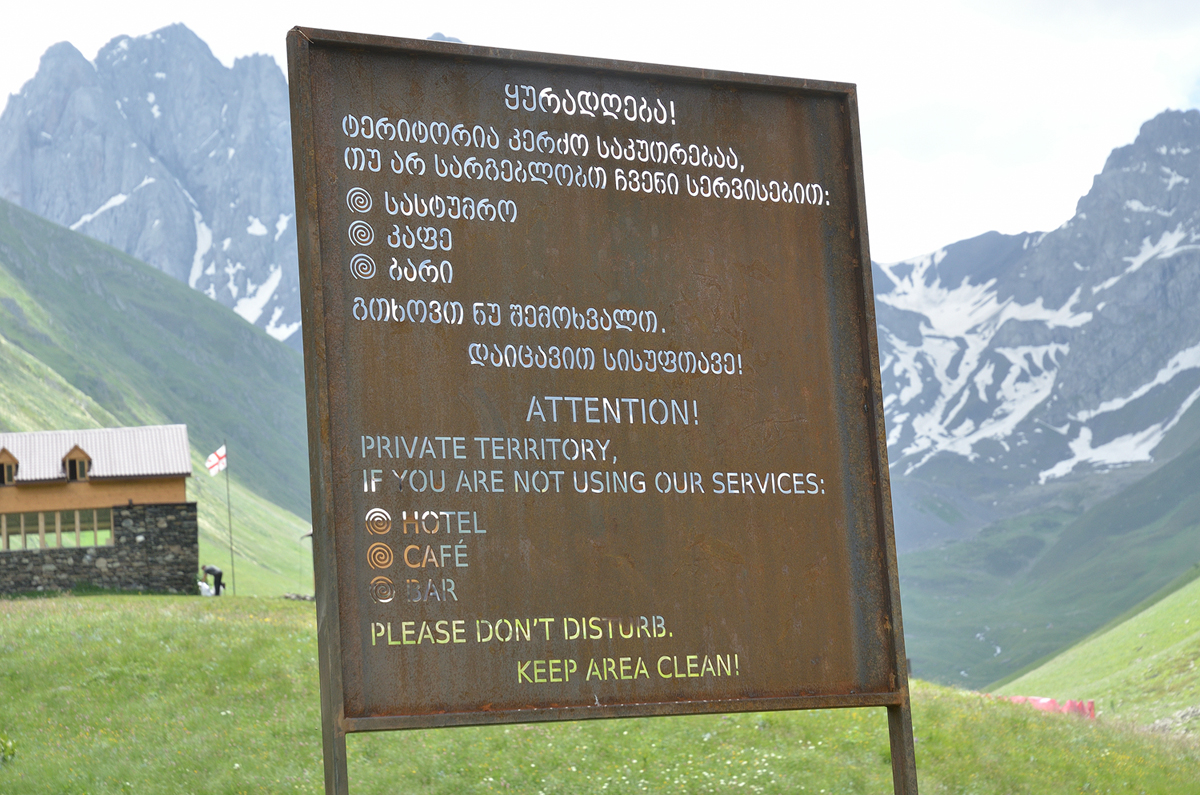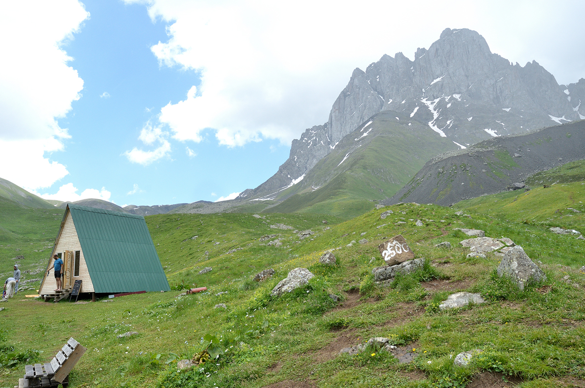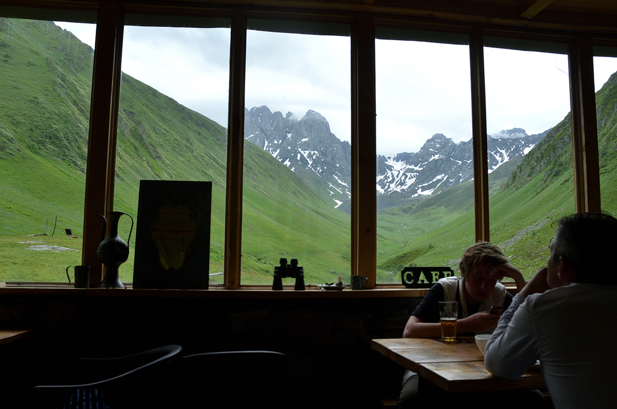 Chaukhi Pass 가기 전에 위치한 Cafe. 이 곳부터 오르막 경사가 조금 심해지며 저 위 돌산 왼편쪽의 언덕(?)을 넘게 된다.