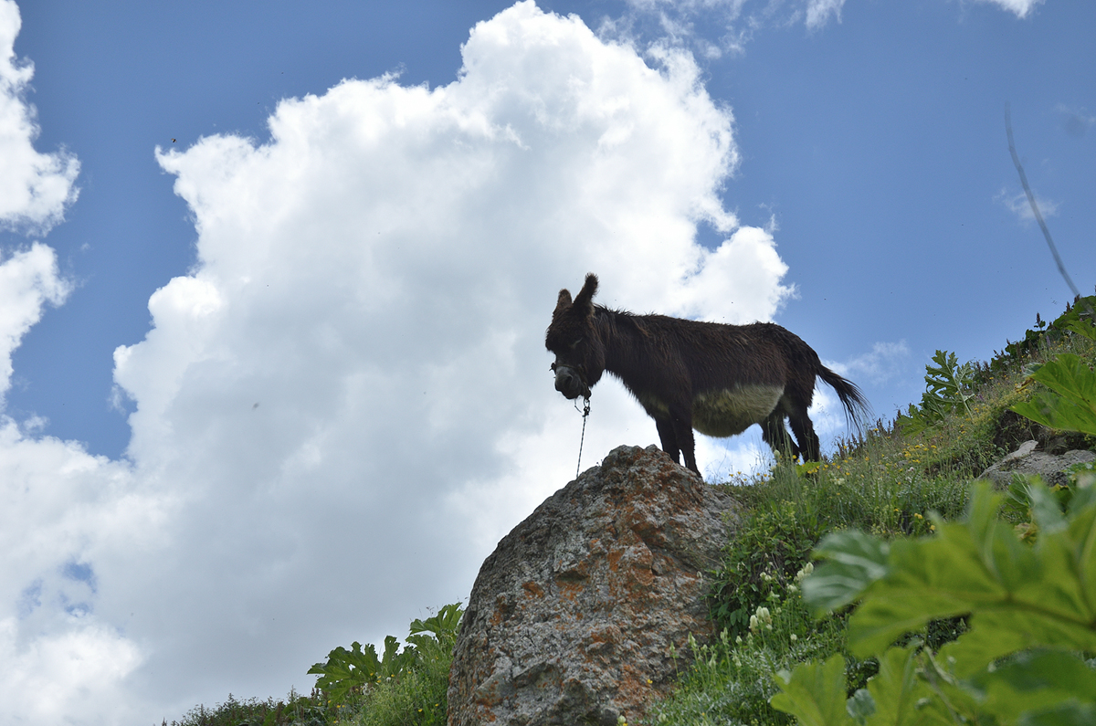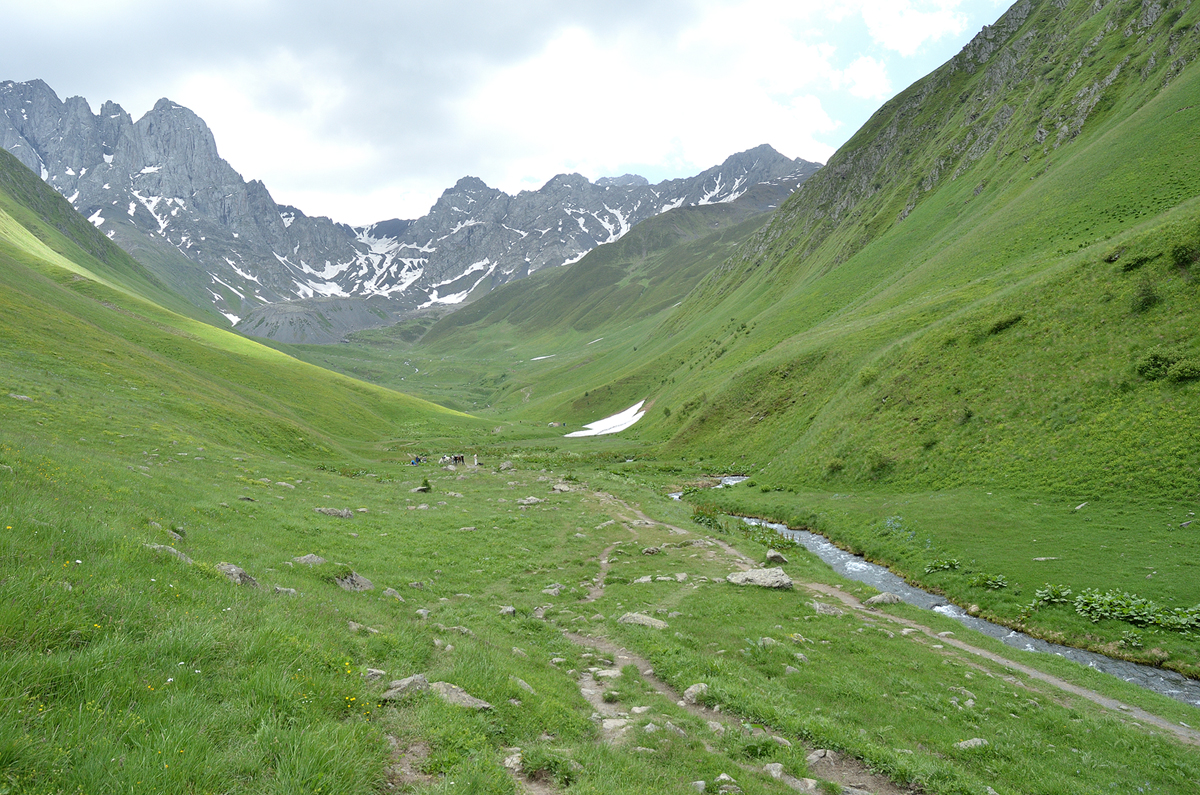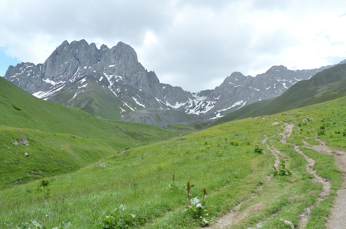 11시 45분에 Juta 마을에 도착해서 주변 경치를 조금 감상하다 트레킹을 시작했다. 목표는 Abudelauri White Lake까지. Juta 마을에서 트레킹 첫 시작 길을 찾기가 조금 어렵다. Justistskali 강 건너 조금 올라가다보면 우측으로 집들 사이로 올라가는 샛길이 있는데 그곳이 트레킹 시작 길이다.