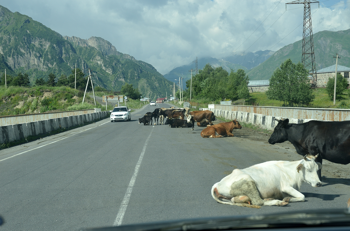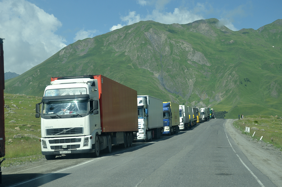 도로에 줄지어 있는 트럭들. 카즈베기는 러시아와 국경이 마주하고 있으며 근처에서는 러시아로 넘어갈 수 있는 유일한 통로다 해서 러시아로 넘어가는 트럭들이 국경 통과를 위해 줄을 서서 대기하고 있는 모습이다.