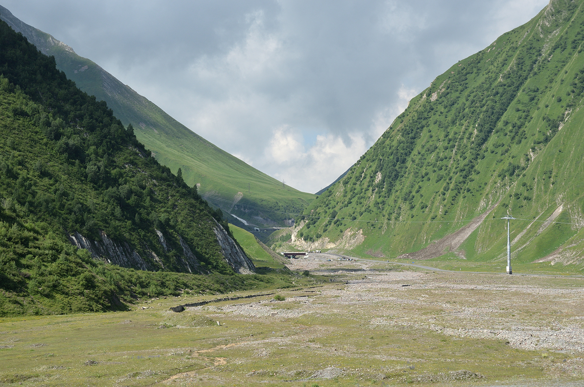 트레킹을 마치고 카즈베기로 돌아오는 길. 앞에 먹구름이 잔뜩 끼어 있고 비가 오기 시작했다. 하지만 트루소 밸리 쪽은 맑은 날씨를 보여주고 있었다. 산악지대다 보니 날씨가 여기 다르고 저기 다르다....