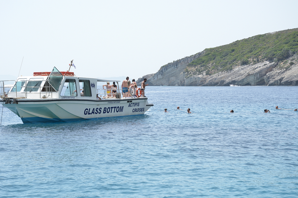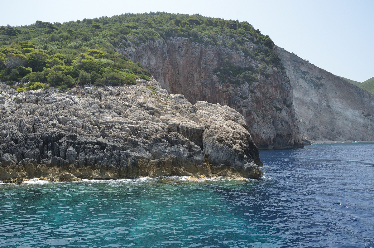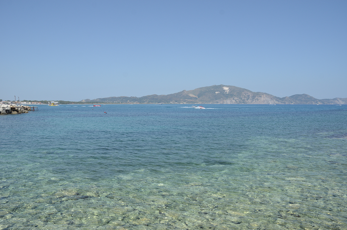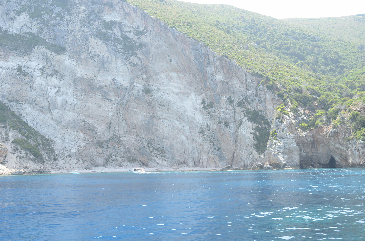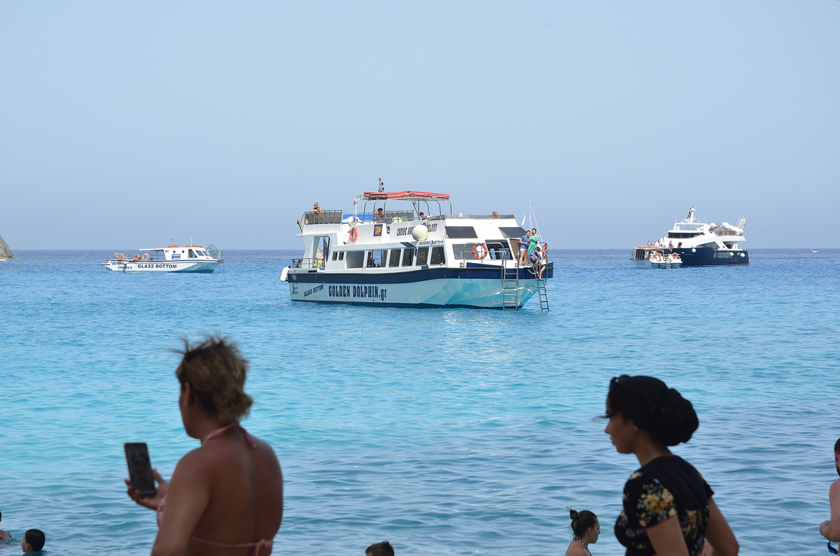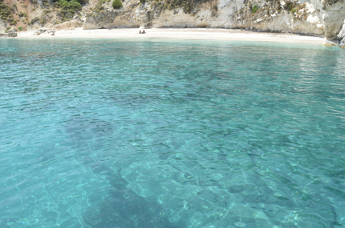 자킨토스 섬에서의 둘 째날. 처음 계획으로는 오전 11시 페리를 타고 섬을 나갈 계획이었으나 막상 Shipwreck Beach를 가지 않고 떠나기가 너무 아쉬워 페리 시간을 오후 3시로 변경하고 다음날 Shipwreck Beach 투어를 나섰다. 이용한 투어는 Golden Dolphin. Shipwreck 보트 투어는 자킨토스항 근처에서 출발해서 Shipwreck Beach를 들른 다음 돌아오는 길에 두 어 군데 더 들러서 수영을 할 수 있는 투어로 4시간가량 소요된다. 투어 배를 탄 해변 모습. 이곳만 해도 물이 엄청 깨끗해서 바닥이 다 보일 정도다.