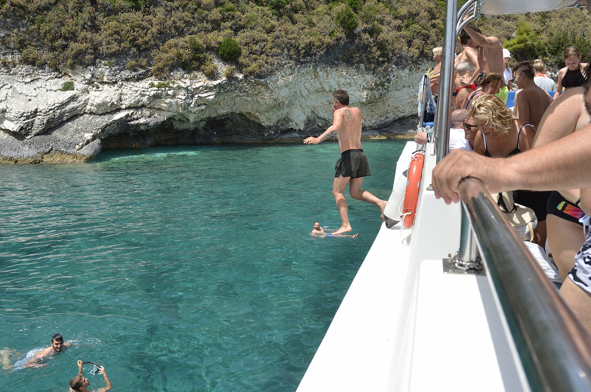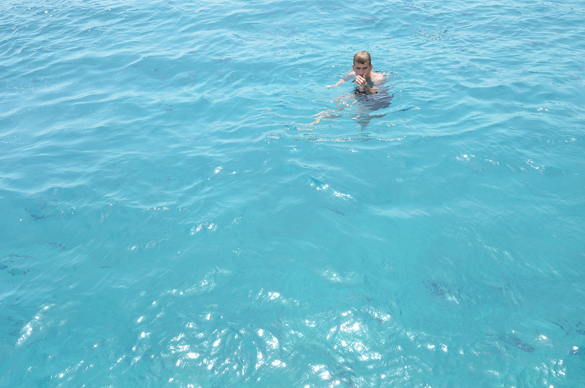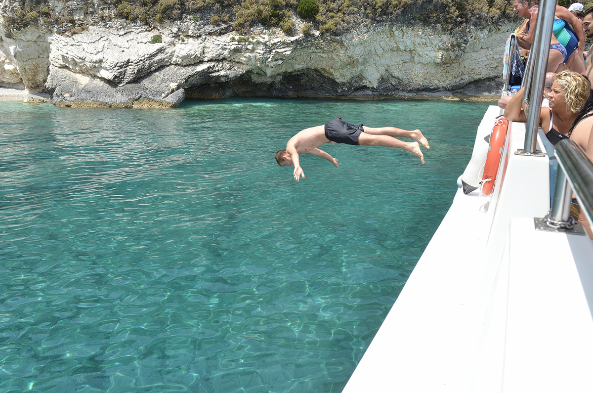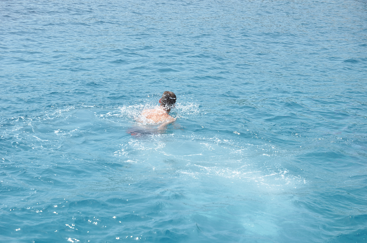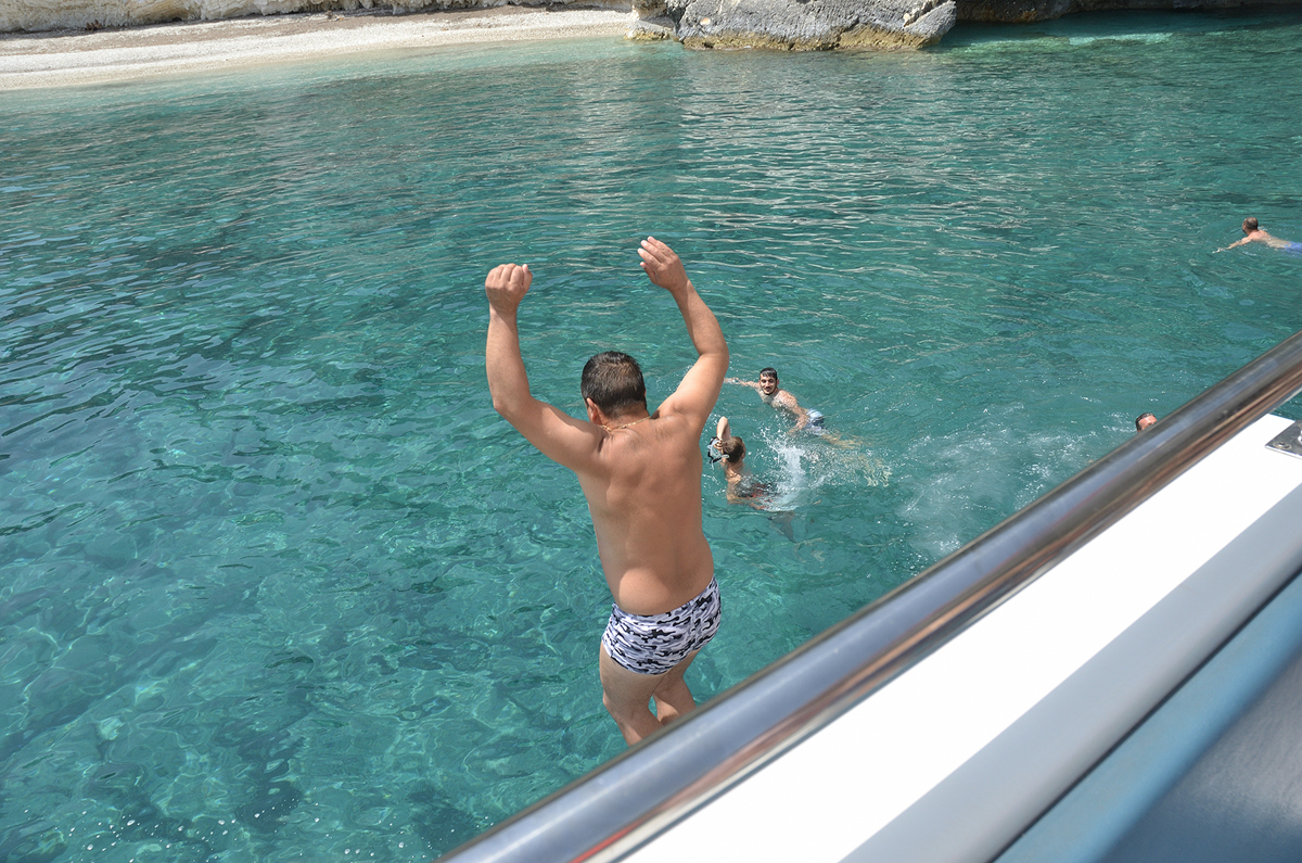 우리 보트에 탔던 사람들도 바다에 들어가서 수영을 즐기고 있다. 나도 동참... ㅎㅎ. 바다 안 사진은 못 찍었지만 블루 케이브 지점은 물고기도 많아서 스노클링 하기 제격이다. 우리 보트에서 제일 먼저 바다에 뛰어든 친구.