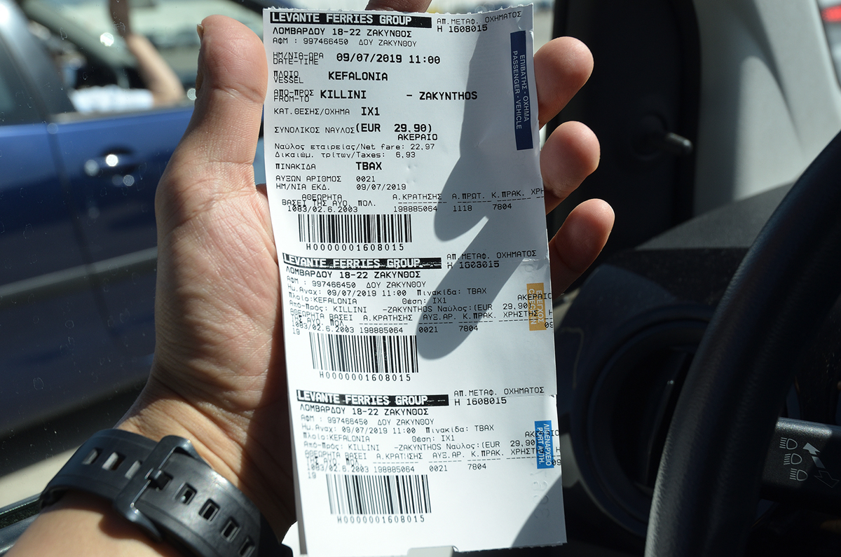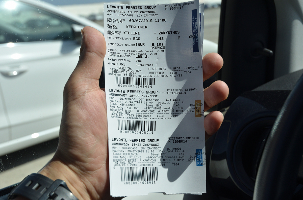 자킨토스섬 가는 티켓. 승객 9.1유로. 차량 29.9유로.