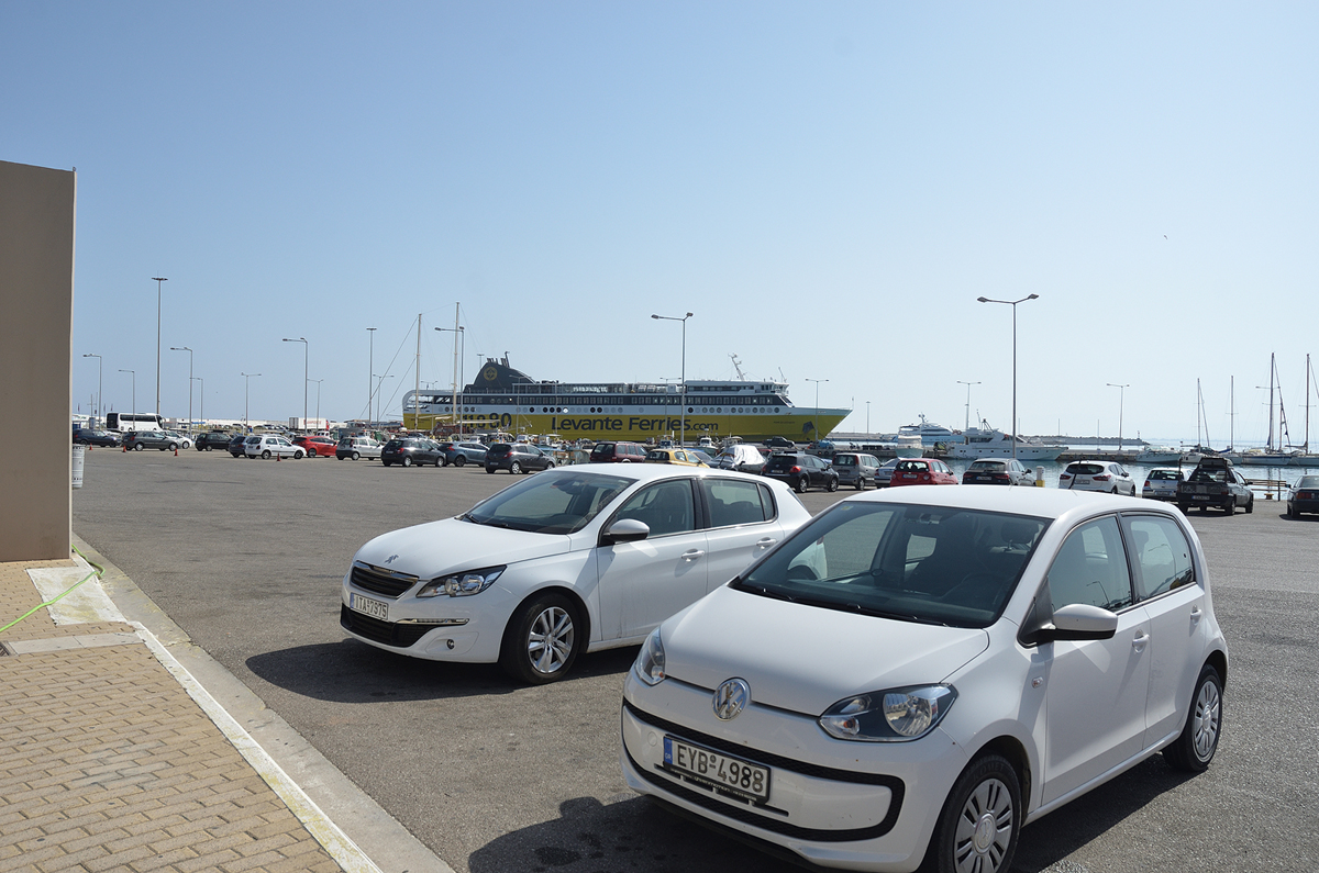 티켓 오피스 앞 풍경. 저 앞에 페리가 대기하고 있다. 사진에서 폭스바겐 차가 나의 렌트 차량. 폭스바겐 UP.