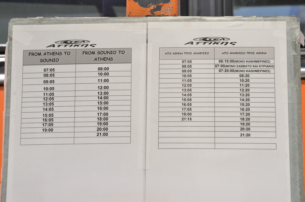 아테네에서 수니온 곶을 가는 방법은 버스를 이용하게 되는데 버스는 M1 라인의 Victoria역 근처 Bus Terminal에서 탈 수 있다. 아테네와 수니온 곶 왕복하는 버스 시간표. 시간은 버스로 1시간 30분 정도 소요된다.