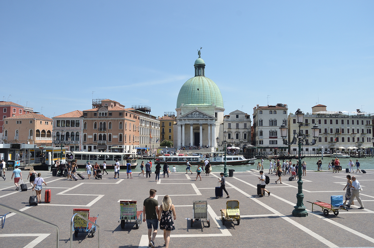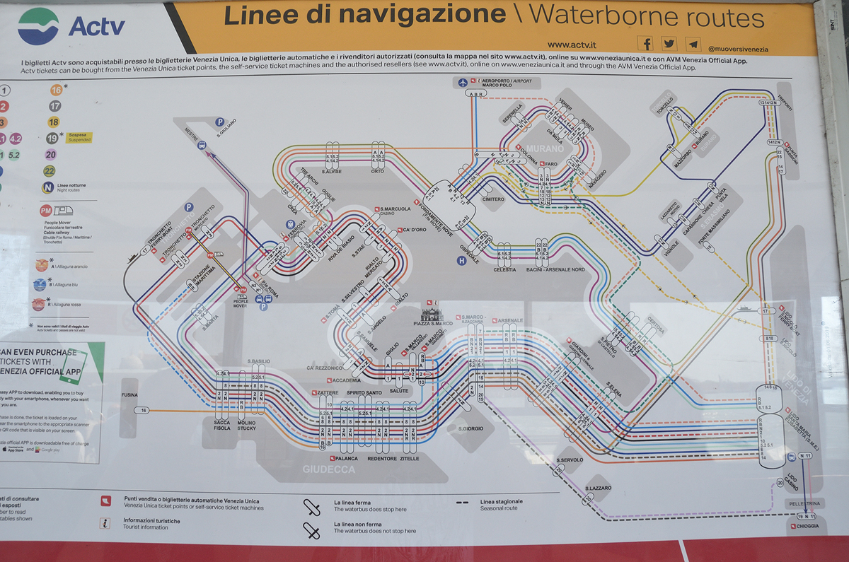 베네치아 산타루치아역 앞모습. 역을 나오면 바로 수로가 보이고 베네치아의 교통수단인 수상버스들이 보인다. 베네치아에서는 주 교통수단이 수상버스인데 수상버스 번호에 따라 노선이 정해져 있다. 또한 배가 상대적으로 크다 보니 같은 정류장도 A, B, C, D 이렇게 다시 나뉘어져 있고 각 정류장마다 탈 수 있는 노선이 다르므로 참고하도록 하자.