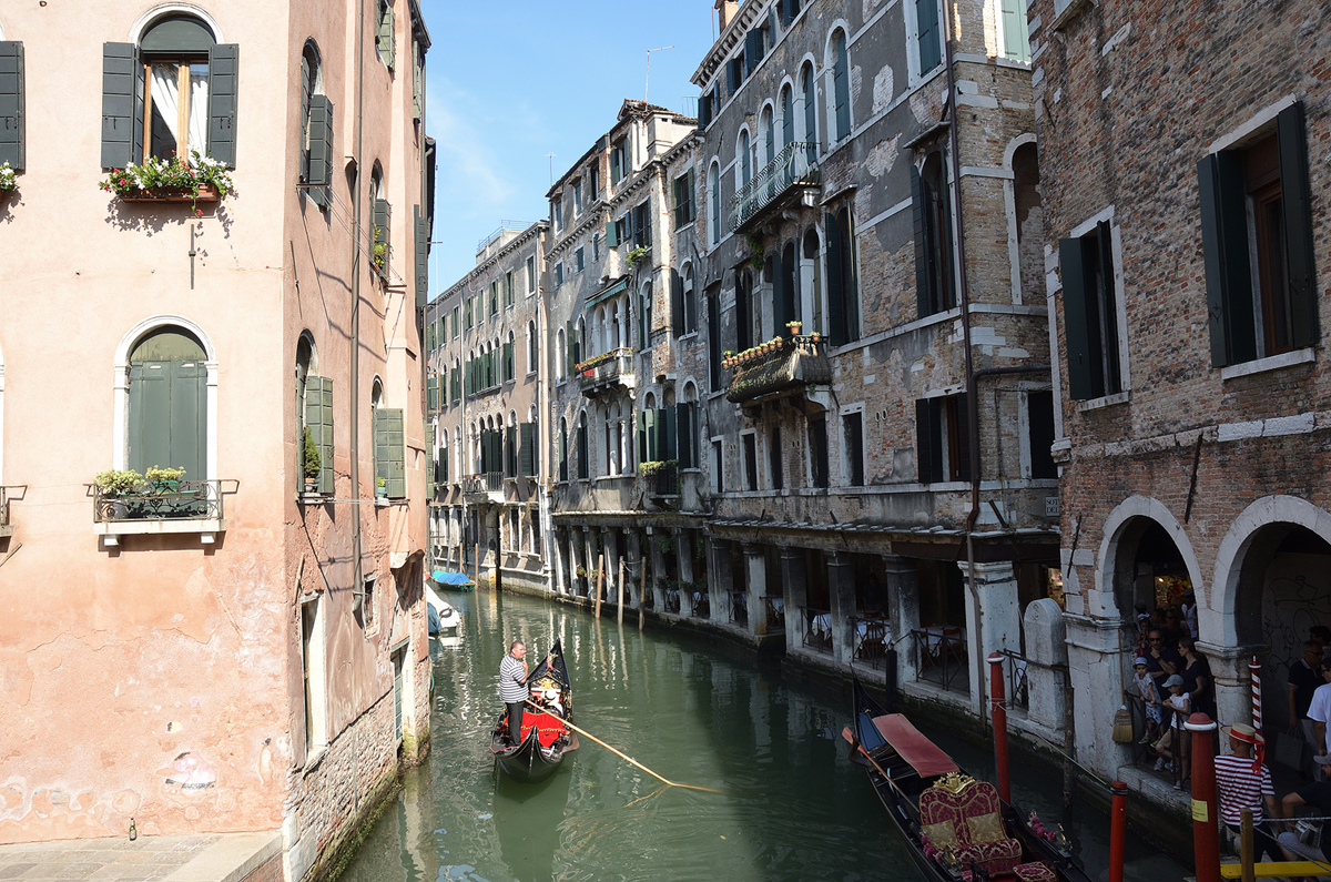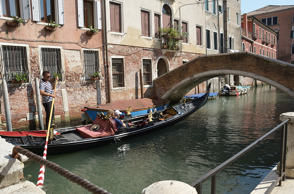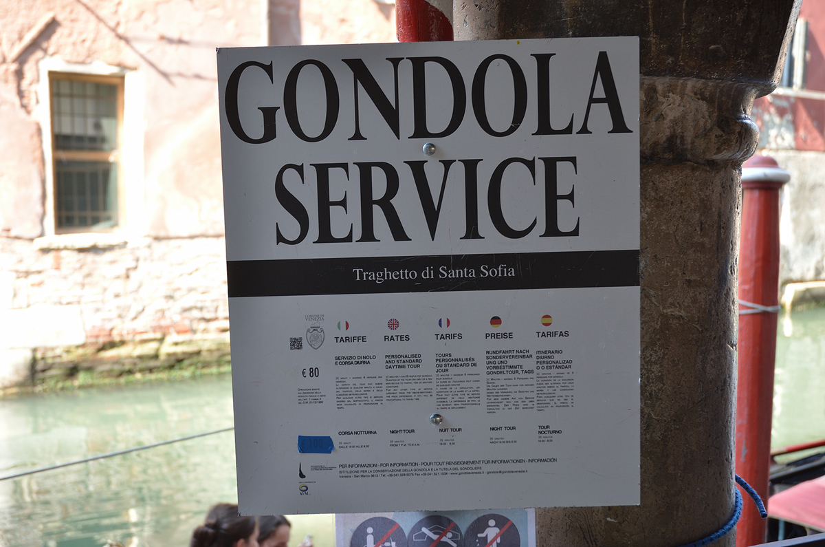 베네치아의 대표적인 교통수단인 곤돌라. 검은색으로 화려하게 꾸며져 있으며 일반 수상버스가 다니지 못하는 좁은 곳까지 다니며 관광포인트를 둘러볼 수 있다 다만 가격이 80유로로 비싸다.