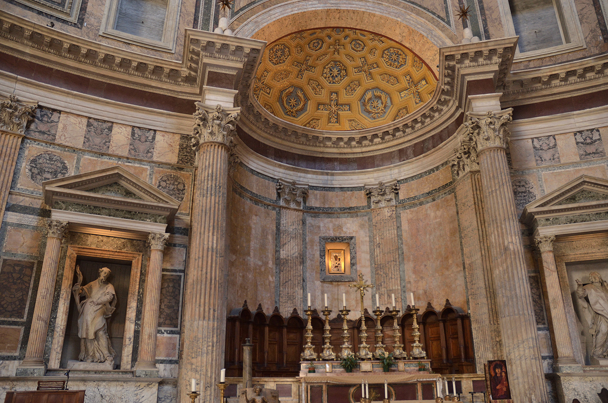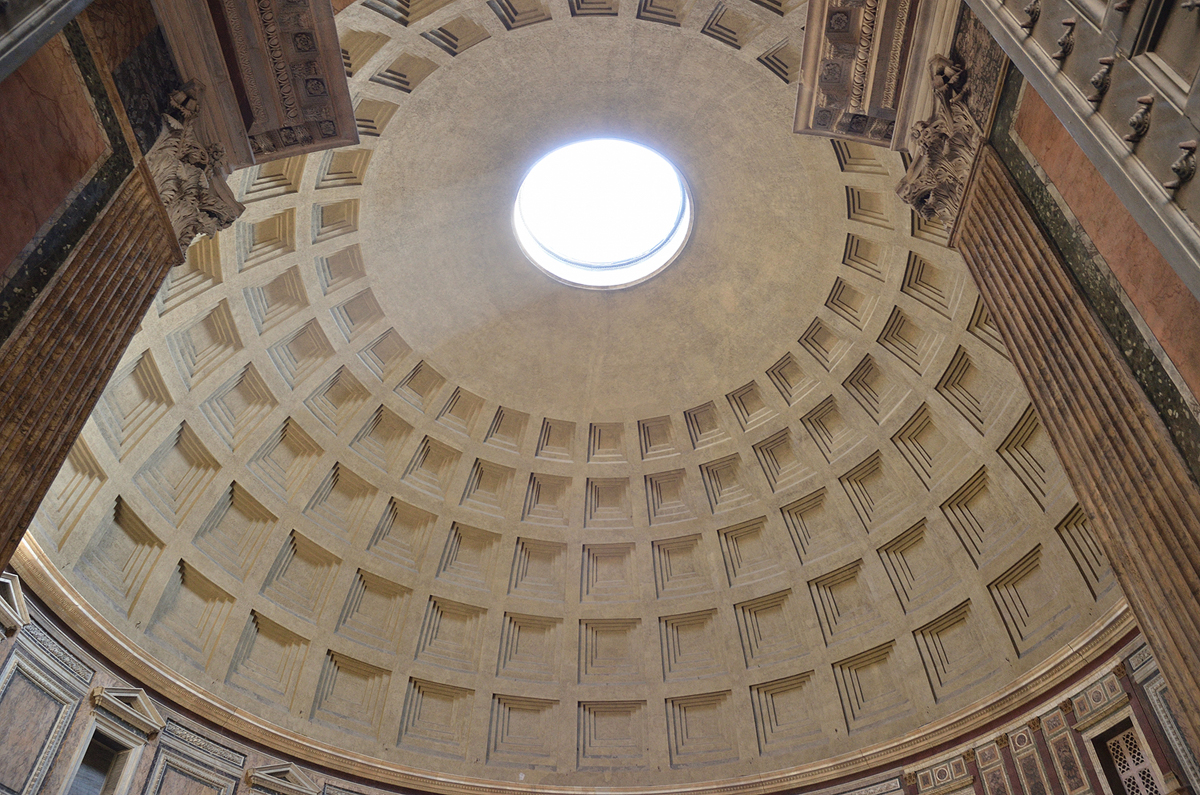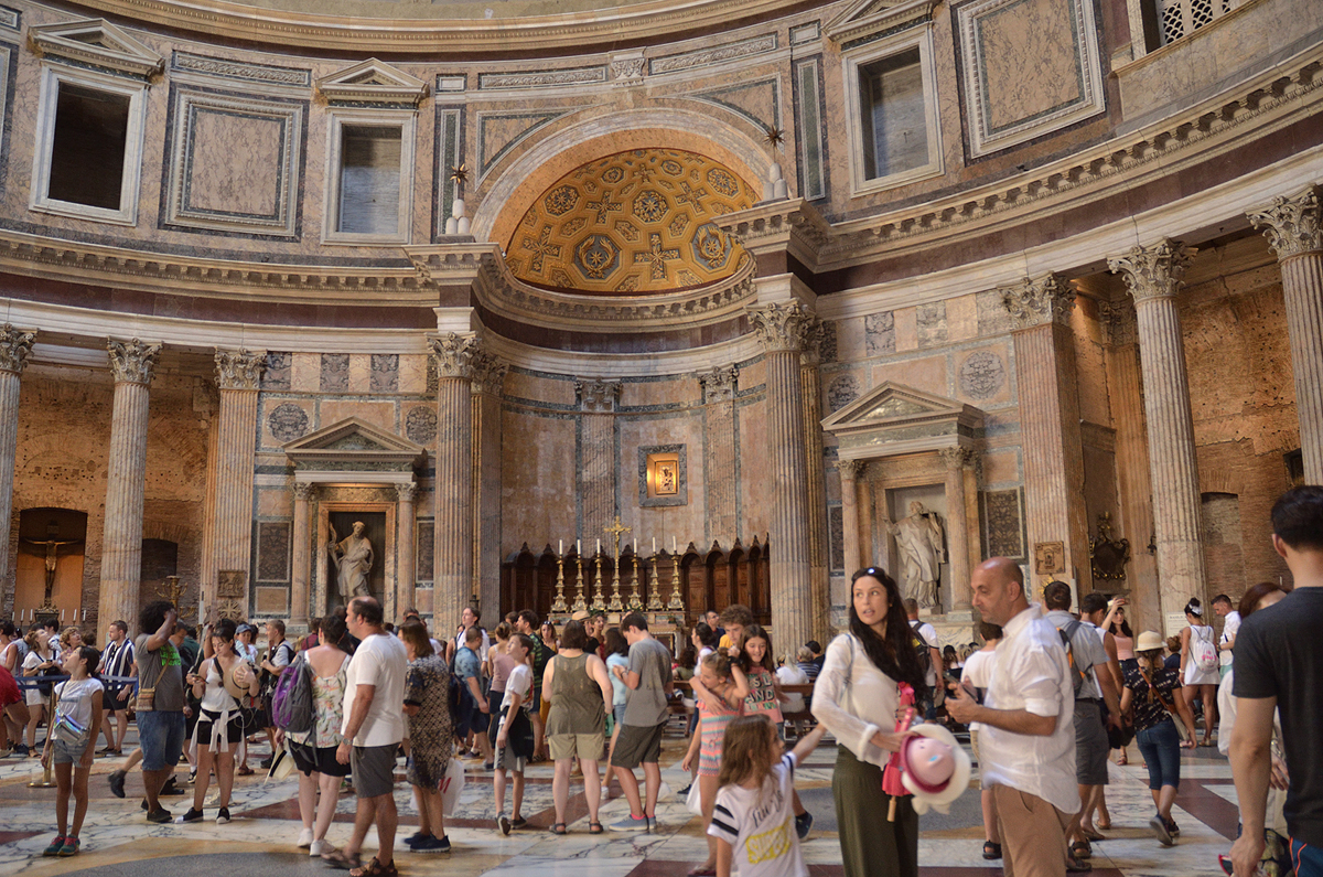 판테온 신전. 고대 로마 신들에게 바치는 신전으로 사용하려고 지은 로마의 건축물로, 하드리아누스 황제 때 서기 125년경 재건했었다. 모든 고대 로마 건축물 가운데 가장 보존이 잘 되어 있고, 전 세계를 통틀어 당대 건물 가운데서도 가장 보존 상태가 좋다고 한다.