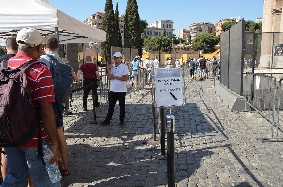 콜로세움 입장권 구매하는데도 조금 어려움이 있었던 것이 입장하는 줄과 입장권 구입줄이 나란히 같이 서게 되어 있어서 아래 사진에서 보이는 저 안내표지판이 잘 안 보인다. 안내원들한테 물어봐도 저기 옆이라고만 얘길 해서 조금 헤맸었다.